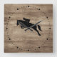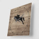 Une belle horloge murale à thème équestre présente une silhouette de cavalier et cheval sur l'arrière - plan en planche de bois.
