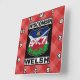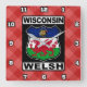 Horloge murale galloise du Wisconsin. Design classique des panneaux de route américains, avec le texte WISCONSIN WELSH, et les drapeaux de l'état du Wisconsin et du Pays de Galles.