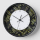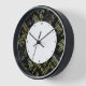 Cette horloge murale comporte des parties d'une carte à circuit imprimé intégrée avec des composants électroniques, principalement des résistances et des condensateurs, étiquetés en jaune vif à la surface avec d'autres composants, contre un arrière - plan noir derrière et autour de la face de l'horloge. Il y a de l'espace dans le centre pour votre nom ou message.