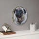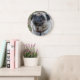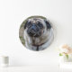 Une belle photo d'un chien carlin imprimé sur une horloge murale ronde.