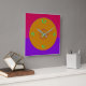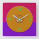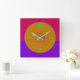 Une horloge vive avec un fond rose cerise et mauve, un cadran doré et des aiguilles vert lime. Horloge simple et accrocheuse pour ceux qui osent être différents ! Disponible en formes rondes et carrées