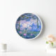 Water Lilies est une série de plus de 200 peintures à l'huile réalisées par l'impressionniste Claude Monet français. Cette belle horloge murale présente l'un de ces tableaux colorés. Il dispose d'un étang avec des fleurs de nénuphars dans les tons bleu et rose.