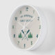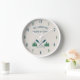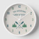 A beautiful, rustic themed wall clock, featuring your family name and lake house house, cabin, cottage or other desired text and its its its established date, all in rustic style typographiy. This unique, custom design feteal blue boat oars, paddles and pine trees in soft green. The designs cream base color is easily customizable to match your current decor To see designs like this, feel free to visit my store here at "Zazzle.com/Rustic_Charm" Thanks.