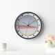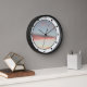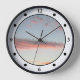 Nuages ageux aux couleurs du coucher du soleil, ciel bleu pâle. Ressemble à la vue à travers un hublot. Numéros noirs en gras à 12, 3, 6 et 9, avec des points marquant d'autres chiffres.