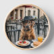 Profitez du charme et de l'humour de cette adorable scène où se trouve un chien de classe portant une fedora et des lunettes, pour savourer tranquillement un petit-déjeuner servi dans un café de trottoir français. Avec des crêpes, des toasts et un verre de jus d'orange, cette image mêle élégance et comédie dans un instantané unique, parfait pour les imprimés, les affiches ou le contenu des médias sociaux qui se démarque par sa personnalité et son esprit.