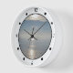 Soleil brillant à travers des nuages agités au-dessus d'une surface plate de l'océan avec le soleil réfléchi. Ressemble à la vue à travers un hublot. Numéros noirs en gras à 12, 3, 6 et 9, avec des points marquant d'autres chiffres.