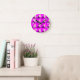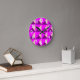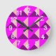 Cette horloge murale a une conception Bauhaus de triangles qui se chevauchent en violet, magenta et rose.
