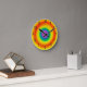 This is a brightly colored wall clock with numbers which would be perfect for a childs room. The design is of rainbow colored sunburst swirls in bright yellow, red, orange, green, blue and purple. Designed by Lark