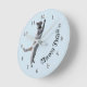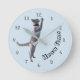 Cat standing on hind legs, swiping paw at 12. Curved text at right reads Meow Time Numerals are white with gray drop shadow, background is light blue.