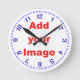 This template provide a simple clock face numbers. Simply add your own image to the centre. You can add any image you like, but the ideal size is a horizontal image 2500 x 2500 pixels. Check out our other clocks to see other colours and designs, or to see some finished clocks made up.