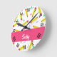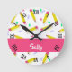 Horloge Ronde Crayons et rayures jaunes sur blanc