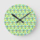 This clock is covered with a mid-century design of retro atomic starbursts on a green back ground.