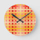 Cette horloge a un design géométrique de lignes dans les tons rouge et jaune tissé pour faire un plaid.