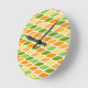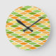 Cette horloge murale a un design moderne du milieu du siècle des diamants aplatis dans les tons jaune, orange et vert.