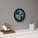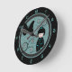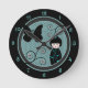 Japanese doll in kimono dress against a blue and black polka dot background and ornate oriental tree and pattern on eye catching wall clock.