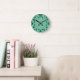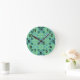 Cette horloge murale a un design moderne du milieu du siècle des flèches dans deux tons de bleu sur un champ de vert de mer.