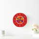 This round wall clock feobjets white numerals and an abstract fiery fractal art in golden yellow, orange, red, et purple on a red background.