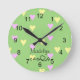 Personalize this round wall clock with any name on this pastel green, pink, and yellow heart pattern. Addition pour tout nursery ou pour tout le monde. Just edit the already formatted text in the easy Zazzle editor. Created in part with graphics from www.colorfulclipart.com et www.scrappincop.com