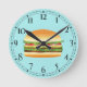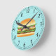 Cette horloge présente une délicieuse illustration de dessin animé d'un hamburger. Le hamburger est fait de viande, laitue verte, tomates rouges, oignon, tranche de fromage et quelques cornichons. Le petit pain a l'air frais et il y a des graines de sésame sur le dessus. Le visage de l'horloge est fait de chiffres noirs élégants.