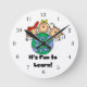 Three stick figure kids surround a world globe and text reads "It's Fun to Learn !" on school themed T-shirts, cards, mugs, stickers, buttons, and other gear !