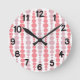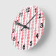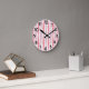 Cette horloge murale a un design moderne du milieu du siècle de rose et lavande rectangles arrondis dans la taille croissante et décroissante en courant verticalement sur un champ de blanc.