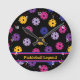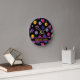 Rose néon, jaune et violet sur motif noir pickleball, texte personnalisé Horloge ronde. Parfait comme cadeau pour joueur de pickleball. Texte personnalisable des deux côtés Heureux d'utiliser et de meilleurs voeux pour vos futurs jeux!