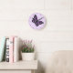 Cette horloge présente une belle illustration d'un papillon violet de couleur arrière - plan lilas. Le visage de l'horloge est fait de lignes noires simples et élégantes.