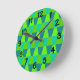 Cette horloge murale a un design Bauhaus de trapézoïdes répétés dans les tons bleu et vert.