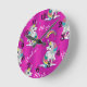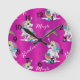 Une mignonne horloge murale à licorne, avec un motif coloré de licornes et d'étoiles, et les mots "Arc en ciel" et "Magie", le tout sur un arrière - plan rose foncé. Cela ferait une belle horloge pour une crèche, ou chambre d'enfant.