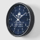 A beautiful, rustic themed wall clock, featuring your family name and "Lake House" or other desired text along with its established date and location. This custom, design unique objets a white silhouette of crossed boat oars and pine trees on print of wood planks in rich blue colors. To see designs like this, feel free to visit my store here at "Zazzle.com/Rustic_Charm" Thanks.