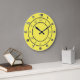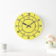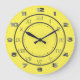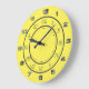 Numéros romains et arabes affichés dans les anneaux extérieurs. Marques de hachage de minute sur le cercle intérieur. Numéros dans des couleurs argentées à l'aspect métallique, divisant les anneaux en gris foncé, le tout sur un joyeux arrière - plan jaune.
