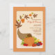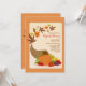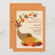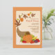 A modern harvest-themed invitation featuring a pumpkin and vegetables next to a cornucopia and falling leaves. Perfect for a harvest dinner party or Thanksgiving dinner party.