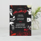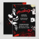 Cool, fun, horror Halloween Party invitations with a spooky, creepy black rooftops silhouette scene with bats, a cat and a full moon. There is awesome shiny red dripping blood running down the invites. On the reverse is more blood and a scary tombstone with vampire skulls for you to personalize with your party details. Fabulous horrific invites for adults and family parties