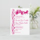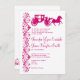 These vintage wedding invitations have an elegant horse drawn carriage design with a heart on the side of the carriage door. It also has elegant vintage flourish flowers and vines flowing down the left hand side of the invitation. The horse and carriage and flourish design is a hot pink fuchsia magenta colour. The back of the invitation also has the horse and buggy at the bottom of the invitation with flourishes on either side.