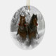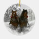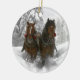 Two beautiful draught horses in a snowy wood. Back, red, and gold design. Perfect gift for the horse or nature lover.