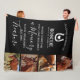 Elegant horse tribute keepsake blanket featuring a simple black background, a 4 photo collage of the horse your remembering, a sympathy quote that reads "when someone you love becomes a memory, those memories become treasure", a horseshoe with a heart, the name of your horset, and their birth/death date. This modern animal memorial blanket is easy to customize, and is the perfect gift for you, your family, or friends to honour those special horses who are no longer with us.