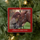 Personalized Photo Christmas Tree Ornament template you can custom design with a photo of your pet horse with cute and funny "Neigh Bells Ring" wording and their names and year in a festive rustic red typography design.