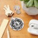 Graphic abstract motif Ink tattoo style drawing Hungarian influence, with King Arpad and a horse in the centre and watching eye at the top with drama masks on the side and palm silhouettes around the border