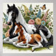 Beautiful image featuring a horse with its foal lying on a serene meadow surrounded by colourful flowers, embodying a sense of peace, connection to nature, and tranquil harmony.