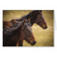 A close up colour photographic image of two horses one in the foreground is in focus, and the one in the back ground is just slightly out of focus for a nice effect. Both horses are a dark brown which is complimented by the golden grass field in the background. There is a very earthy, rural country feeling to this image and it is finished with a nice vignette to draw your eye into the photo. This product is customizable. Choose your style or options to make it just the way you like it.