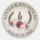 Horseshoes and pink, burgundy mauve Flowers rustic barn favour sticker with bride and groom's names and wedding date.