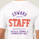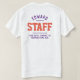 Staff t-shirt for a hospitality company. Printed Both Sides Hospitality Staff T-Shirt. Add the name of the Staff Member to create a personal company shirt for your employees to wear when with guests. Great hospitality business t-shirt.