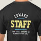 Smaller Graphics Option. Staff t-shirt for a hospitality company. Add the name of the Staff Member to create a personal company shirt for your employees to wear when with guests. Great hospitality business t-shirt.