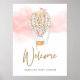 Cute watercolor design in pink and gold with a lovely illustration of a floral hot air balloon and pink clouds.