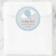 Round sticker for bridal shower favour with blue hot air balloon design and polkadot background.