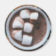 Hot chocolate in a cup and saucer, floating creamy marshmallows. Looks steamy, chocolatey and delicious.