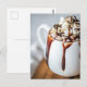 This postcard features a close-up photo of a mug of hot chocolate topped with marshmallows.