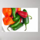 Jalaneno, Serrano and Habanero chilis in a white bowl on a light background