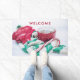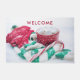 A welcome doormat with a warm comforting Christmas photo. A hot cup of cocoa with marshmallows in a cute red and white polka dot mug. A striped candy cane resting on a green and white striped scarf covered in snow. Ahhh, a warm drink after coming in from the cold really hits the spot. A festive holiday photo.