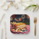 A hot dog with the word "AMERICA" written in mustard is placed on a patriotic plate with French fries against a backdrop of vibrant fireworks